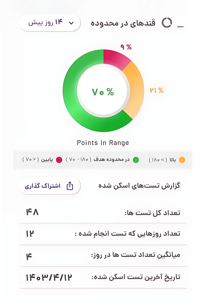 این نمودار در یک نگاه وضعیت مدیریت دیابت شما را بهطور کامل نمایش میدهد. رنگ سبز (قند خون بین ۷۰ تا ۱۸۰) نشاندهنده قندهای در محدوده هدف است و میزان موفقیت شما در کنترل دیابت را مشخص میکند. رنگ زرد مربوط به قندهای بالاتر از محدوده هدف (بیش از ۱۸۰) است و رنگ قرمز قندهای پایینتر از محدوده هدف (کمتر از ۷۰) را نشان میدهد.